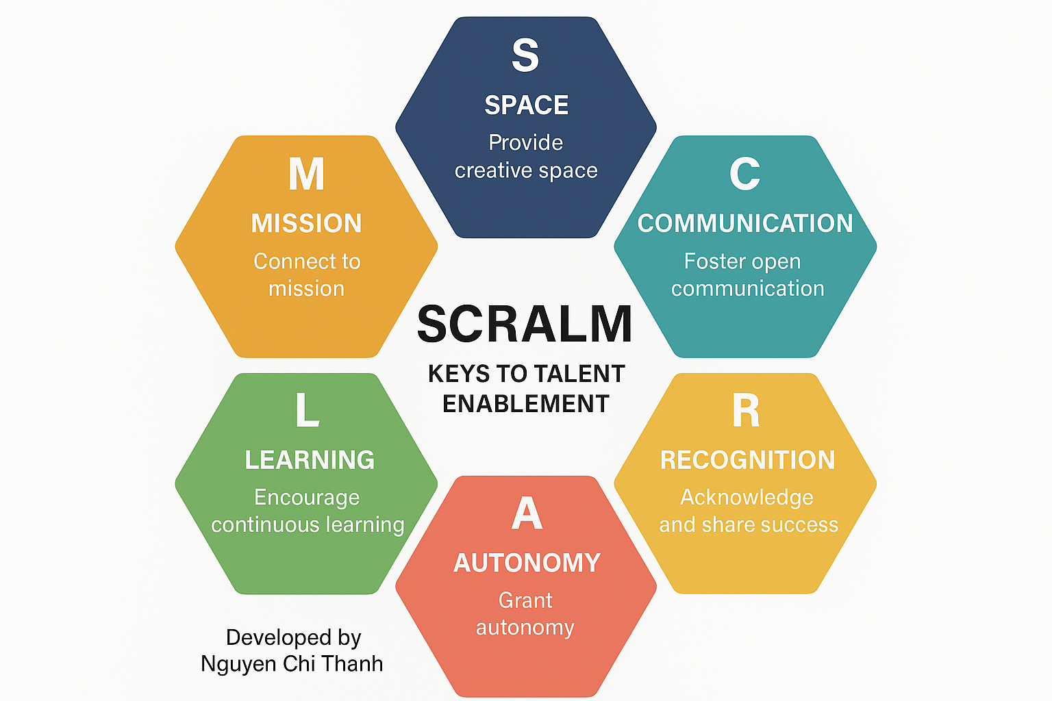 Để mở khoá TR, Nguyễn Chí Thành đã phát triển khung học thuật SCRALM – Keys to Talent Enablement, gồm 6 chìa khoá: