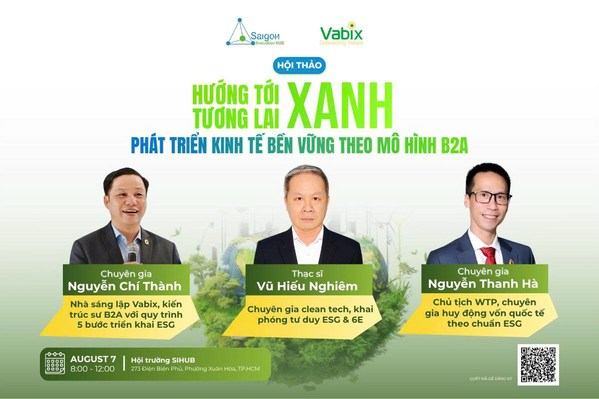 Trung Tâm Khởi Nghiệp Sáng tạo TP Hồ Chí Minh (SIHUB) phối hợp cùng Làng Kết nối Kinh Doanh Vabix trân trọng tổ chức Hội Thảo chuyên đề về kinh tế bền vững, diễn ra từ 08:00 đến 12:00, Thứ Năm ngày 07/08/2025 tại hội trường SIHUB (273 Điện Biên Phủ, Phường Xuân Hòa, TP.HCM). Sự kiện nhằm kết nối cộng đồng doanh nghiệp, nhà đầu tư và chuyên gia, đồng thời trao tay “bản đồ” triển khai ESG gắn với mô hình Business to Address & Area (B2A) – mấu chốt để mỗi địa chỉ và địa bàn đều trở thành tâm điểm phát triển xanh, bền vững.