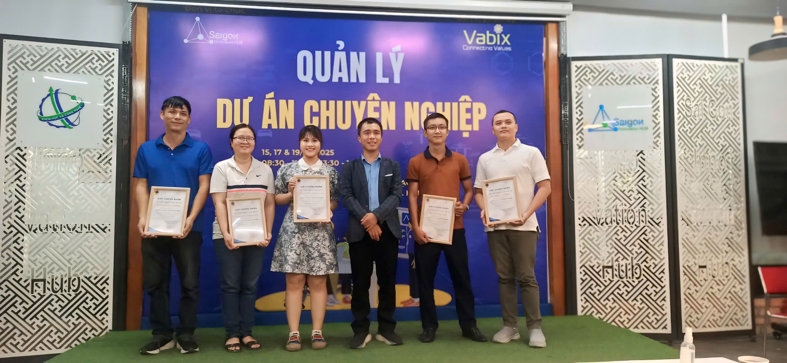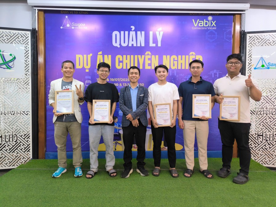TP.HCM, 19/07/2025 – Saigon Innovation Hub (SIHUB) phối hợp cùng Làng Kết nối Kinh Doanh Vabix vừa tổ chức lễ bế giảng lớp “Quản lý Dự án Chuyên nghiệp”, đánh dấu cột mốc quan trọng sau 6 buổi đào tạo chuyên sâu. Hơn 30 học viên là đại diện các startup và doanh nghiệp vừa & nhỏ (SME) đã nhận chứng nhận hoàn thành, sẵn sàng vận dụng ngay kỹ năng quản lý từ khởi động đến bàn giao dự án.